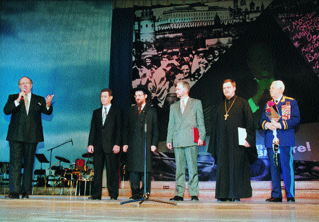 Слева направо: народный артист России М.С. Глуз, президент группы компании «Терра» Игорь Макаров, раввин Берл Лазар, заместитель председателя духовного управления мусульман европейской части России шейх Фарид Асадуллин, протоиерей Всеволод Чаплин, председатель Совета по взаимодействию с общественными объединениями ветеранов и офицеров в отставке при президенте России, дважды Герой Советского Союза маршал авиации А. Ефимов.