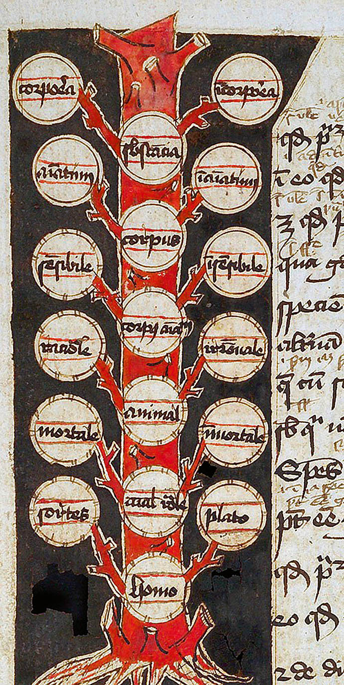 Почему именно дерево? Хотя Хайес ссылается на миф о «Вседреве», имеющийся во многих культурах, и на два дерева в Эдемском саду, он отдает предпочтение другому, более неожиданному источнику зрительных образов, — средневековой науке. Когда‑то самыми распространенными иллюстрациями в научных текстах были древовидные диаграммы, а также концентрические круги, изображавшие в астрономических трактатах небесные сферы (в каббалистической графике такие круги тоже использовались). Взять хоть так называемое Древо Порфирия : то «была разновидность инфографики, идеально годящаяся — совсем как в наше время диаграмма Венна — для отображения всевозможных абстрактных взаимосвязей». Древо Порфирия, наподобие каббалистического древа, состоит из центрального столпа медальонов. от которого ответвляются другие кружочки; оно наглядно изображало иерархические системы философских понятий — такие, как категории Аристотеля. На похожих диаграммах часто изображали родословные, в том числе генеалогическое древо Иисуса. В обоих случаях кружочки обозначали понятия или объекты, а линии — то, как они взаимосвязаны: хоть логические, хоть родственные отношения. Хайес, намекая на обеспокоенность теологическими вопросами, подчеркивает еще одно преимущество древовидной схемы: тот факт, что она «не является иконическим означающим». Большинство каббалистов, при всей своей любви к рисункам, считали бестелесность Б‑жественного аксиомой. Древо изображало причинно‑следственные связи сфирот, но ничем не походило на расположение объектов в пространстве. Это позволило каббалистам избежать ловушки антропоморфизма: на их «картах Б‑га» показано, как сфирот связаны между собой и с миром, а не то, как выглядит Б‑жественное на самом деле.