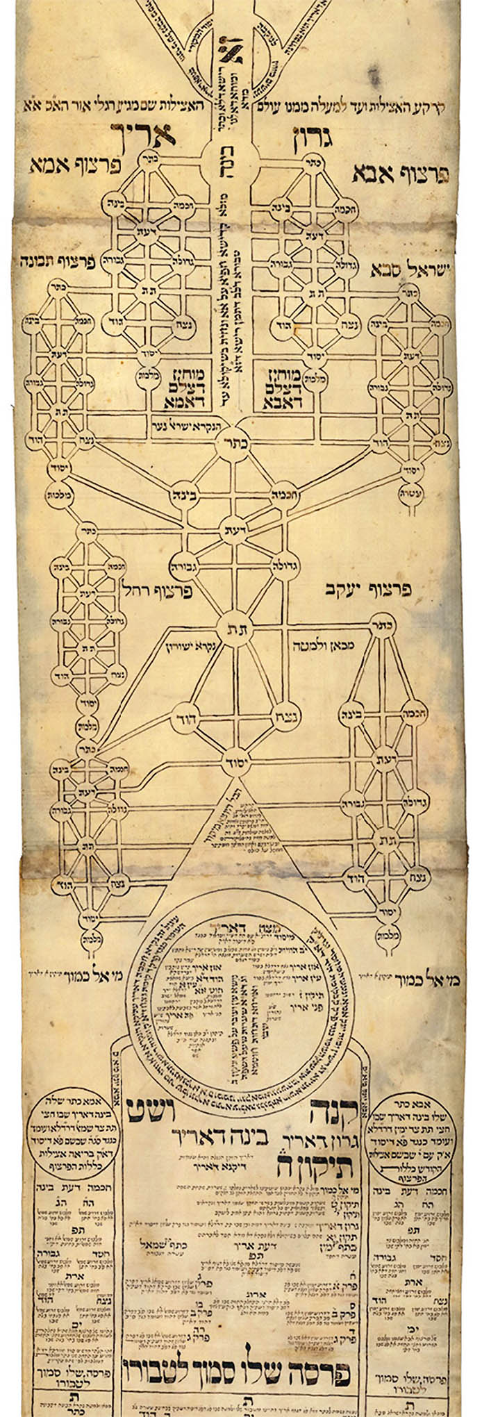 Средневековые еврейские эзотерические традиции, обобщенно именуемые «каббала», никогда не чуждались ярких образов: как‑никак своими корнями они уходят в мидраш с его мифами и в символизм неоплатоников. Возьмем самый классический пример: в книге «Зоар» чуть ли не каждая страница словно бы сверкает — столько там упоминаний об огненных колесницах и изначальных сияниях, райских реках и диковинных птицах. Много каббалистических книг, в том числе масса словарей, посвящены расшифровкам этого калейдоскопического образного ряда в контексте десяти сфирот и других Б‑жественных эманаций. В этой поэтичной символической системе вода символизирует сфиру Хесед (любящая Доброта ), а огонь — сфиру Гвура (суровая Сила), меж тем как солнце и луна обозначают соответственно мужскую и женскую энергию. Вдобавок ранние каббалисты постулировали, что строение макрокосма как Б‑жественной эманации отображено, как на карте, в микрокосме человеческого тела. А структура макрокосма и структура микрокосма, оказывается, очень похожи на строение дерева. Гершом Шолем в книге «Основные течения в еврейской мистике» сформулировал это так: «Два наиболее значительных образа, используемых [для отображения сфирот], — это образ дерева и образ человека ». Хотя бесконечное абсолютно выше человеческого понимания, здесь налицо фундаментальный параллелизм миров, возникших посредством эманации, фигуры человека и формы дерева.