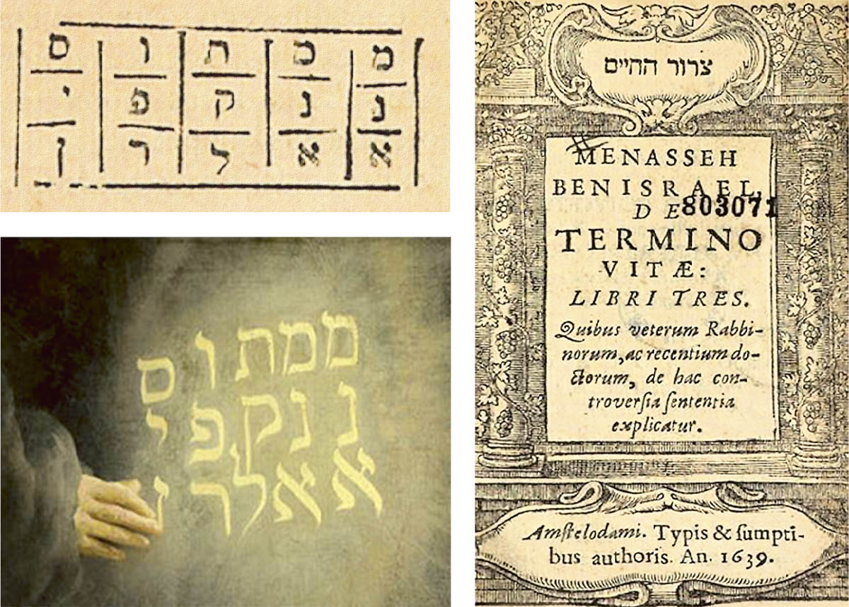 - Слева. Фрагмент трактата Менаше бен Исраэля «О конце жизни» («De termino vitae») с надписью: «Мамтос нанкапи аалран» Фрагмент работы Рембрандта «Пир Валтасара». Справа. Титульный лист трактата Менаше бен Исраэля «О конце жизни». Амстердам. 1639