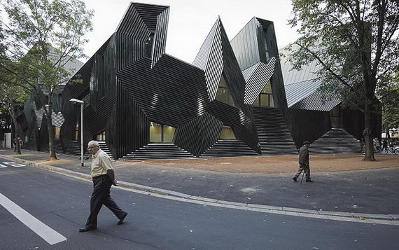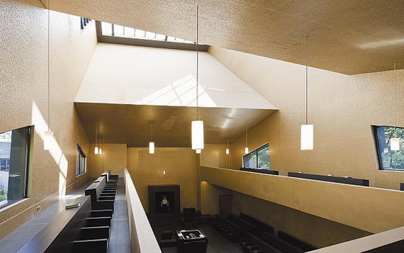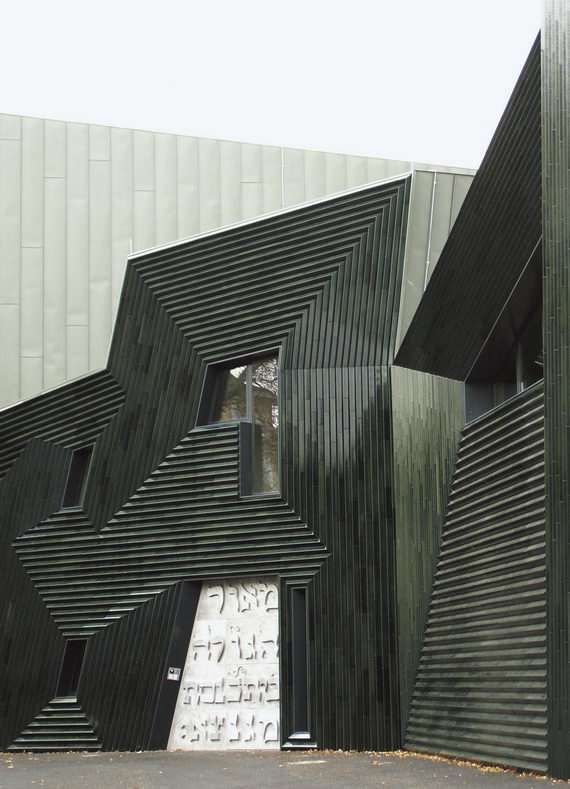 Это подсказало ему архитектурное решение новой синагоги. Его синагога не имеет округлостей, она геометрически строга и в то же время демократична для приближающегося к ней или просто проходящего мимо по улице человека. Она расположена вдоль небольшой площади и чуть огибает ее. Весь этот общинный центр имитирует домашнее пространство: здание не возвышается, а как будто улеглось на площади, прохожий может подойти и потрогать необычную ребристую поверхность стен. Здесь нет высокого крыльца и парадного входа. Стены наклонены под разными углами, все здание покрыто керамической плиткой, тоже под разными углами, и все эти углы, наклоны и отражения создают эффект переменного освещения: свет как будто играет на стенах, и в разное время суток сооружение меняет цвет, становясь то серебристым, то синеватым, то коричневатым. Издалека непонятно, из чего сделаны стены — то ли металл, то ли деревянная черепица. А это специальная керамика. Керамику подбирали и укладывали очень долго, Герц не отступал от своего проекта, в ребристости поверхности был его принципиальный замысел. Внутри отделка стен и потолков задумывалась еще сложнее: стены испещрены рельефными буквами еврейского алфавита — кропотливая работа художника‑скульптора, прекрасно выполнившего замысел проекта.