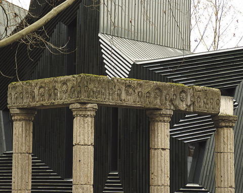Перед новым зданием стоит старая арка с колоннами — это музейная часть, остатки старинной синагоги.