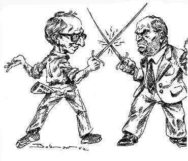 - Карикатура. Вуди Аллен (с газетой «Новое присутствие», торчащей из кармана) и Джозеф Маккарти. Символическая дуэль. «Новое присутствие». 1 октября 1982