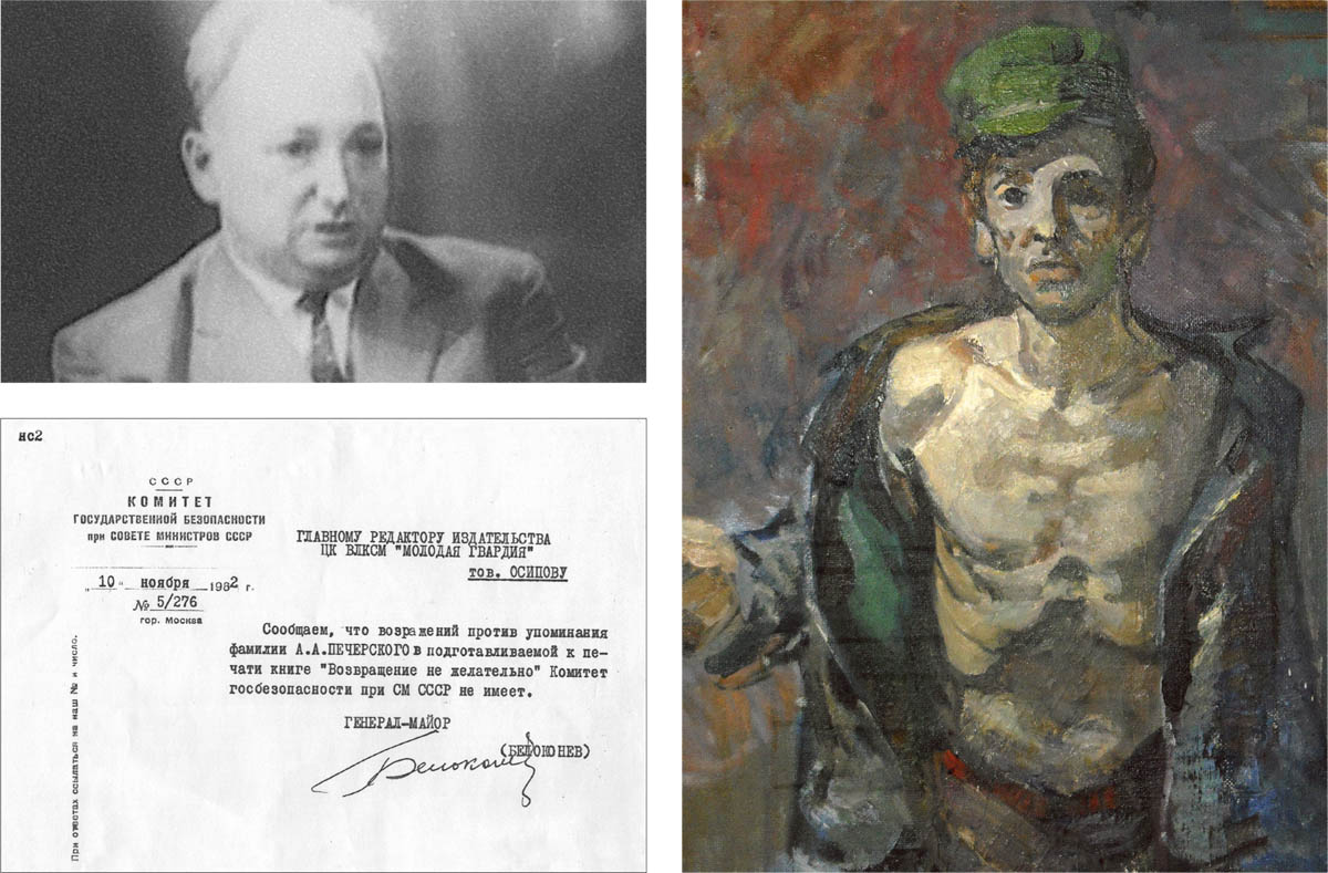 - Вверху. Выступление Александра Печерского на ростовском телевидении с рассказом о восстании. 1962. Внизу. Разрешение КГБ упоминать имя А. Печерского в книге В. Томина и А. Синельникова «Возвращение нежелательно». 10 ноября 1962. Справа. Набросок к картине «Александр Печерский». Художник Игорь Солдатенков. Архив Андрея Солдатенкова