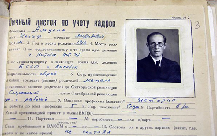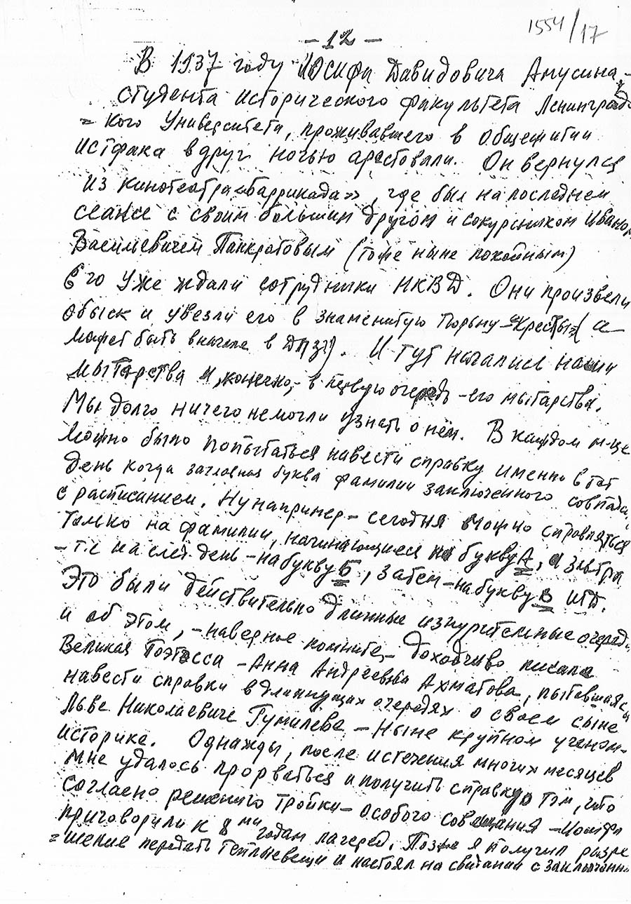 В nbsp;1937 году Иосифа Давидовича Амусина, студента исторического факультета Ленинградского Университета, проживавшего в общежитии истфака, вдруг ночью арестовали. Он вернулся из кинотеатра «Баррикада» <…> Его уже ждали сотрудники НКВД. Они произвели обыск и увезли его в знаменитую тюрьму «Кресты». <…> Мы долго ничего не могли узнать о нем. В каждом месяце можно было попытаться навести справку именно в тот день, когда заглавная буква фамилии заключенного совпадала с расписанием. Ну, например, сегодня можно справляться только о фамилии, начинающейся на букву «А», а завтра, то есть на следующий день, — на букву «Б», затем — на букву «В» и т. д. <…> Однажды, по истечении многих месяцев, мне удалось прорваться и получить справку о том, что, согласно решению «тройки» — особого совещания, Иосифа приговорили к 8 годам лагерей. Позже я получил разрешение передать теплые вещи и настоял на свидании с заключенным.