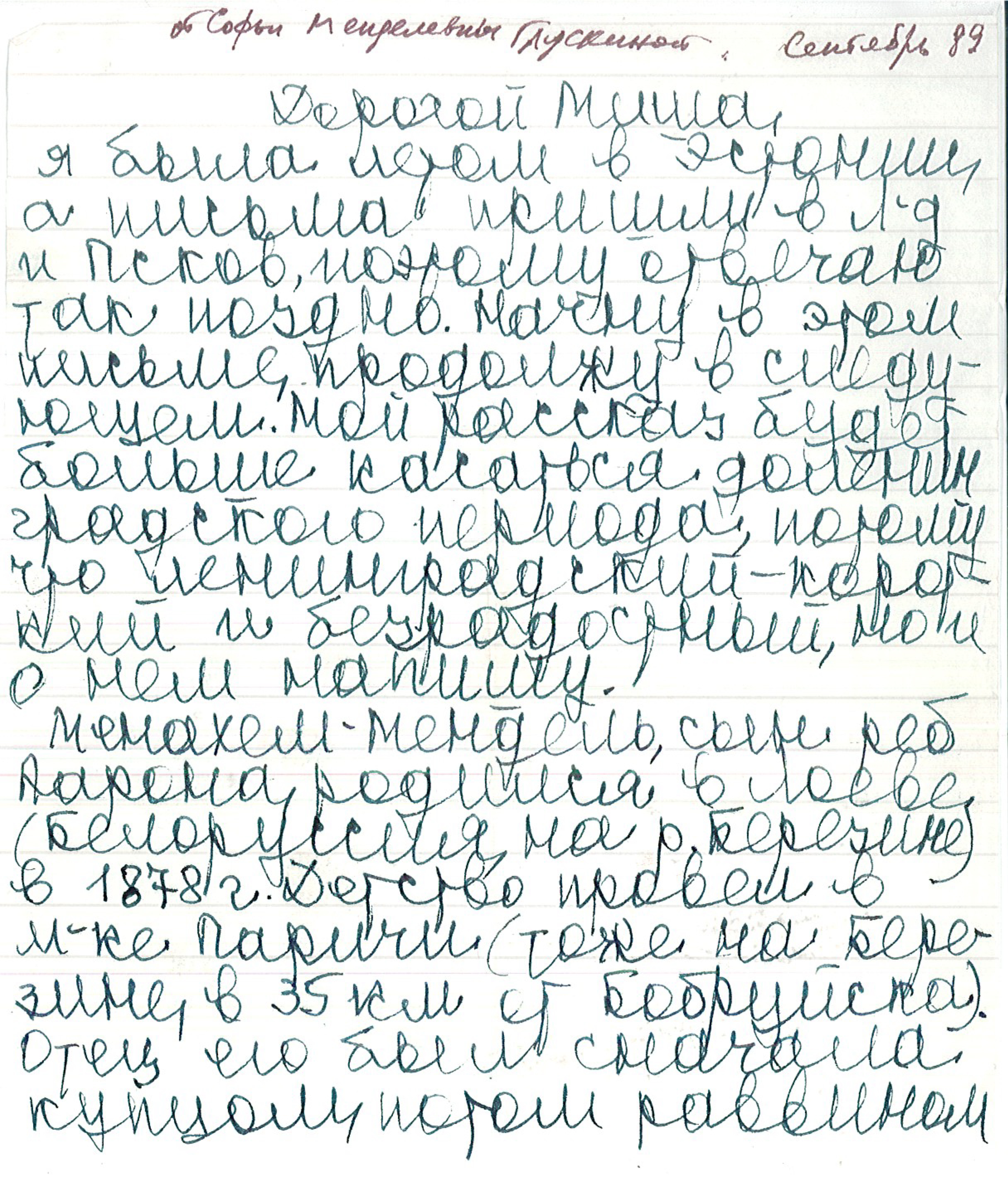 Величайшая добродетель историка — не просто изучать источник, но способствовать его появлению на свет. Самый очевидный способ — интервьюирование, сотворчество в создании биографических и устноисторических нарративов. Но можно способствовать и появлению мемуарных текстов — стоит только попросить. Говоря о так называемых источниках личного происхождения по истории советских евреев, нельзя не упомянуть Центр по исследованию и документации восточноевропейского еврейства при Еврейском университете в Иерусалиме, который и проводил интервьюирование новых репатриантов, и объявлял конкурсы автобиографических очерков: «Мой путь в Израиль» в 1973–1977 годах, «Бейт аба» («Дом отца») в 1980–1984 годах, на которые откликнулись десятки авторов . Тем же занимались и отдельные ученые, преследуя свои исследовательские задачи. Например, историк Михаэль Бейзер, готовя книгу о евреях Ленинграда в межвоенный период, просил разных людей поделиться воспоминаниями, в частности дочерей ленинградских раввинов Давида‑Тевеля Каценеленбогена и Менахема‑Менделя Глускина . Далее мы публикуем письма Софьи Менделевны Глускиной об отце, написанные Михаэлю Бейзеру в сентябре–октябре 1989 года и отложившиеся в архиве Центра по исследованию и документации восточноевропейского еврейства .