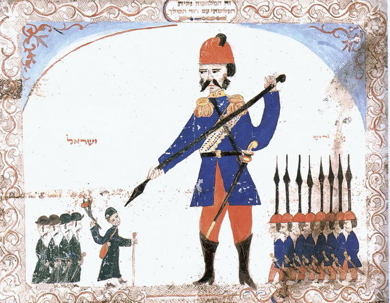 Итак, коль скоро оппозиция «еврейское — нееврейское» носила фундаментальный характер и на внешнем уровне выражалась с помощью костюма, то она с необходимостью должна была воплотиться в костюмах пуримшпилеров. Понятно, что еврейские персонажи должны быть одеты в утрированно еврейские костюмы, но почему нееврейские персонажи одеты обязательно в военный мундир? Наблюдения над костюмами героев «Ахашвейреш‑шпил», в котором все неевреи носят военную форму, можно счесть недостаточным: в конце концов, царь, его первый министр и его слуги выглядят в военной форме довольно естественно. Зато это утверждение может быть обосновано с помощью лубочных картинок.