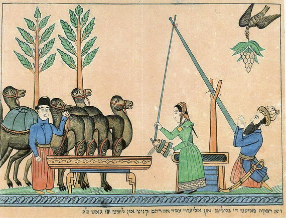 - Ривка и Элиэзер. Бумага, акварель, тушь. Волынь. Вторая половина XIX века. Коллекция РЭМ. Под изображением написано: «Ривка поит верблюдов, а Элиэзер, раб Авраама, преклоняет колени и возносит хвалу Б‑гу, благословен Он» (идиш).