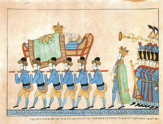 - Похороны Яакова. Бумага, акварель, тушь. Волынь, вторая половина XIX века. Коллекция РЭМ. Под изображением написано: «Как сыновья Яакова несут своего отца в землю Ханаанскую для погребения, а Йосеф идет за ними с множеством старцев египетских с большим почетом» (идиш).