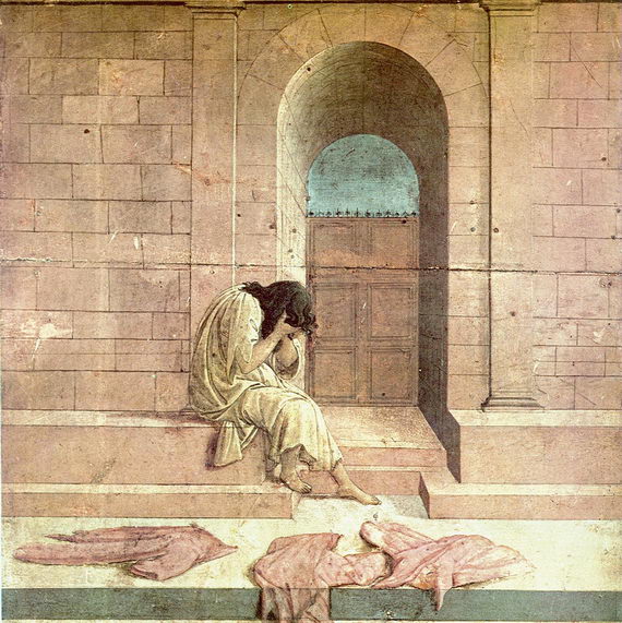 На первый взгляд кажется, что перед нами женщина, сидящая у входа во дворец и предающаяся безграничному горю. Она совершенно одинока, ее одежды разбросаны перед ступенями, лицо скрыто за руками и распущенными волосами. Долгое время искусствоведы полагали, что перед нами абстрактная сцена горя, изображенная в условном архитектурном пейзаже; возможно, имеется в виду женщина, покинутая мужчиной.