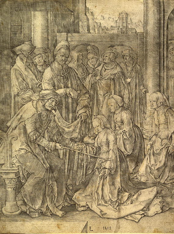 - Эсфирь становится на колени перед Артаксерксом. Лукас ван Лейден. Гравюра. 1518. Музей Метрополитен, Нью‑Йорк