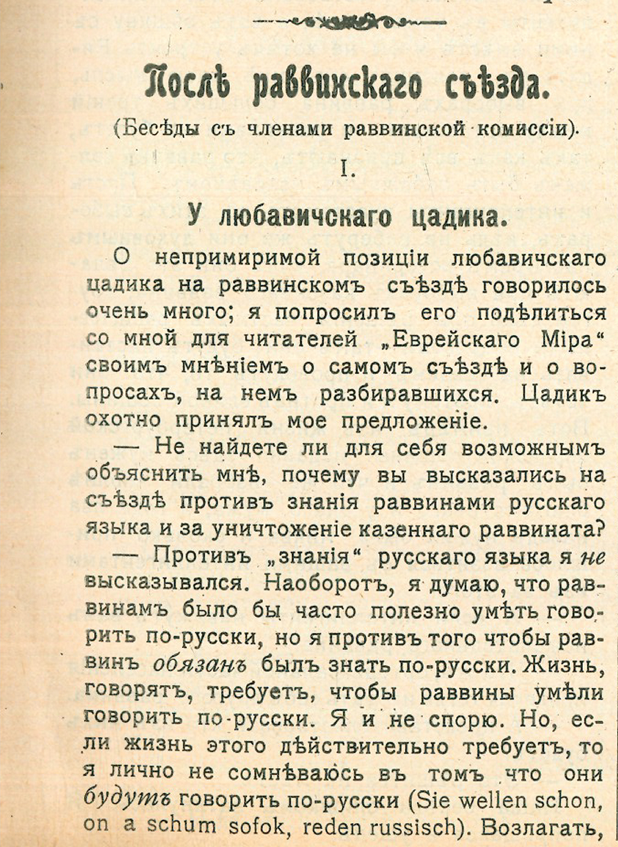 В 1910 году в Петербурге состоялся раввинский съезд, на котором любавичский цадик возглавил крайних ортодоксов. Г. Б. Слиозберг, лидер прогрессивной части съезда, по существу занимал самую реакционную позицию. Редакция «Еврейского мира», членом которой я тогда был, боровшаяся против позиции Слиозберга и его друзей, по моему предложению решила провести беседу с представителями ортодоксии и показать, что прогрессисты занимают гораздо более реакционную позицию, чем ортодоксы. Решено было, что я должен отправиться к цадику для беседы. Свою беседу я, под псевдонимом, опубликовал в журнале, и одесский раввин Полинковский, который участвовал в съезде и жил на одной квартире с цадиком, рассказал отцу, что видел меня у цадика. Узнав об этом, отец написал мне: «Я очень рад был узнать, что ты сподобился лицезреть его святейшество». А моей сестре Соне, жившей с ним до его последнего дня, выразил недовольство, что она ему о таком событии ничего не рассказала и не прочла ему эту статью.