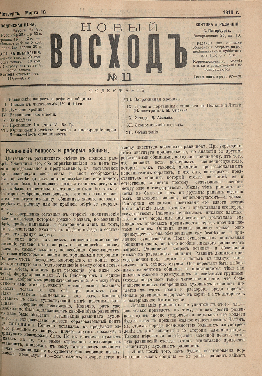 Фрагмент публикации о раввинском съезде «Раввинский вопрос и реформа общины» на первой полосе периодического издания «Новый восход» (№ 11) от 18 марта 1910 года