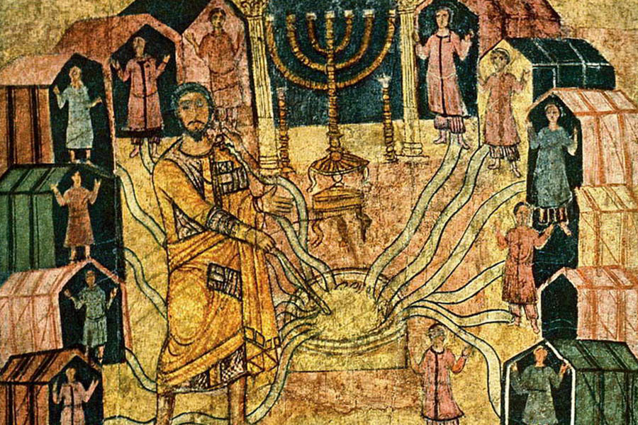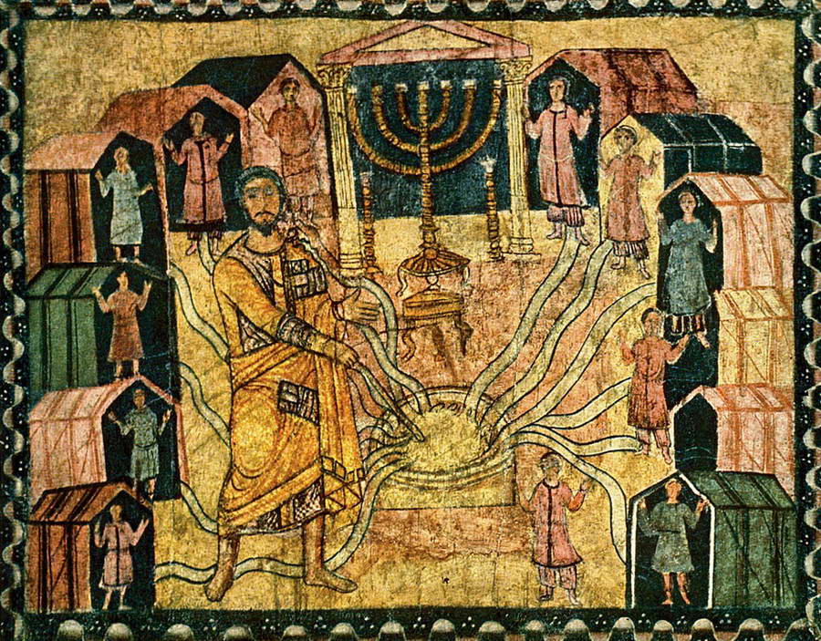 То же самое произошло с великолепными фресками из синагоги в Дура‑Европос, с пола до потолка разрисованной библейскими сценами, — они, скорее всего, давно были бы уничтожены, если бы этот приграничный город не оказался погребен под толстым слоем песка на семнадцать веков. Настенные росписи служили не просто украшением — они творчески переосмысляют эпизоды библейской истории. Например, на одной из них изображен Моше, черпающий воду из колодца, — этот сюжет, вероятно, вдохновлен всеми «водными» чудесами, связанными с Моше, и особенно древними легендами о волшебном колодце, который везде сопровождал сынов Израиля во время их странствий по пустыне.