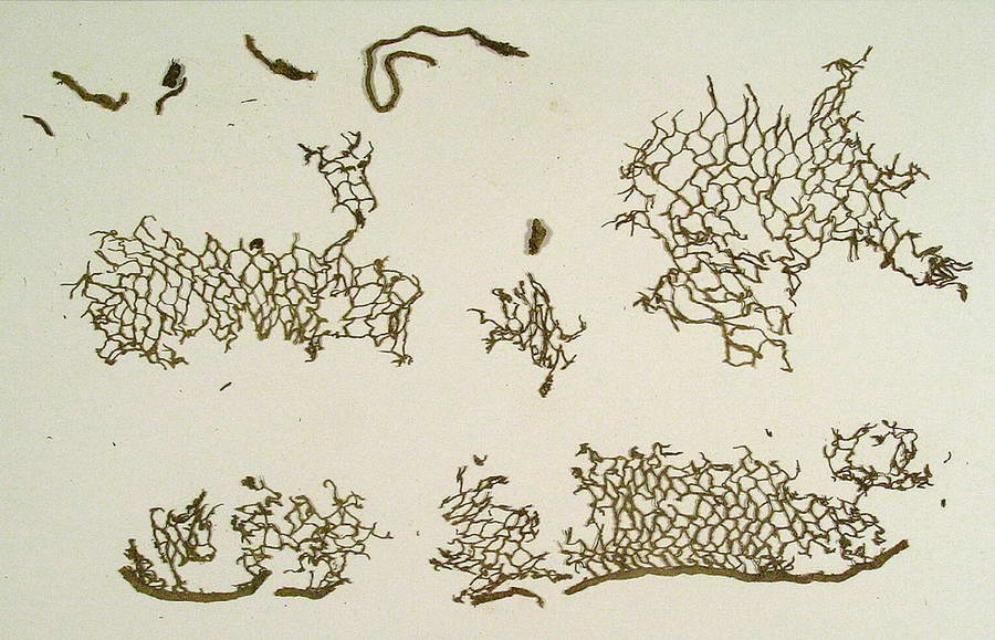 Четыре фрагмента сеточек для волос из окрашенной шерсти, найденных в Масаде и сохранившихся благодаря местному сухому климату
