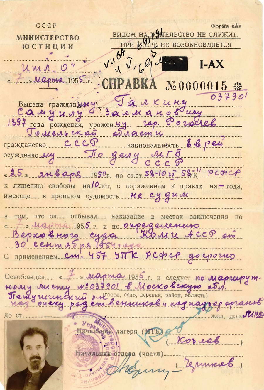 Справка об освобождении Самуила Залмановича Галкина от 7 марта 1955