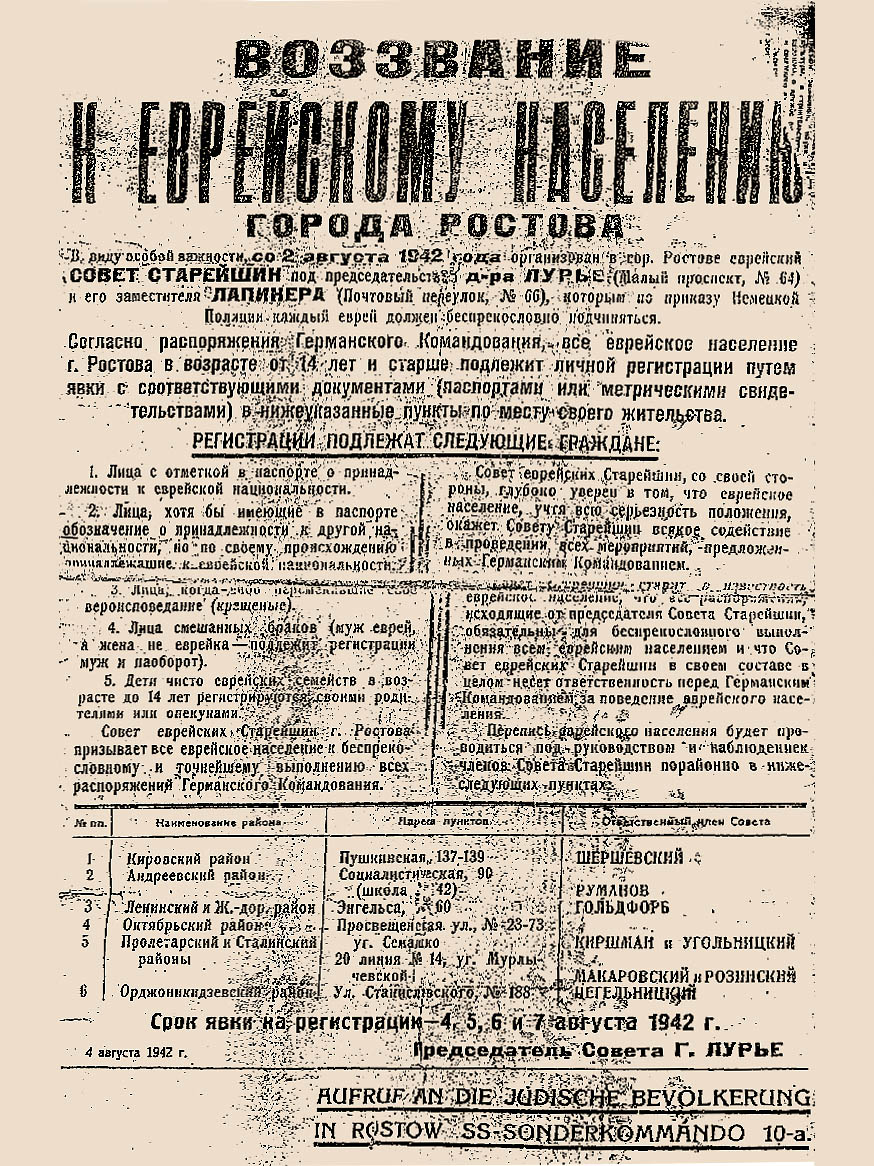 В первом, датированном 4 августа, сообщалось о создании 2 августа юденрата во главе с председателем доктором Лурье и его заместителем Лапинером . Всем ростовским евреям в возрасте от 14 лет и старше в течение 4, 5, 6 и 7 августа приказано было явиться с паспортами или метрическими свидетельствами в пункты регистрации и зарегистрироваться как евреи. Таких пунктов было назначено шесть — в разных частях города, в каждом дежурил ответственный член юденрата .