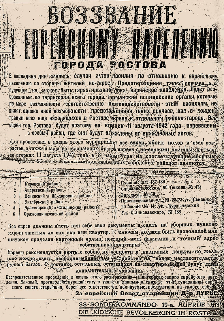 Последовавшие затем приказы‑воззвания к ростовским евреям были изданы уже не от имени немецких властей (штадт‑комендатуры) и не от имени властей российских‑антисоветских (бургомистра), как это чаще всего происходило в подобных случаях, а от имени властей еврейских: от доктора Г. Лурье как председателя городского Совета еврейских старейшин (юденрата).