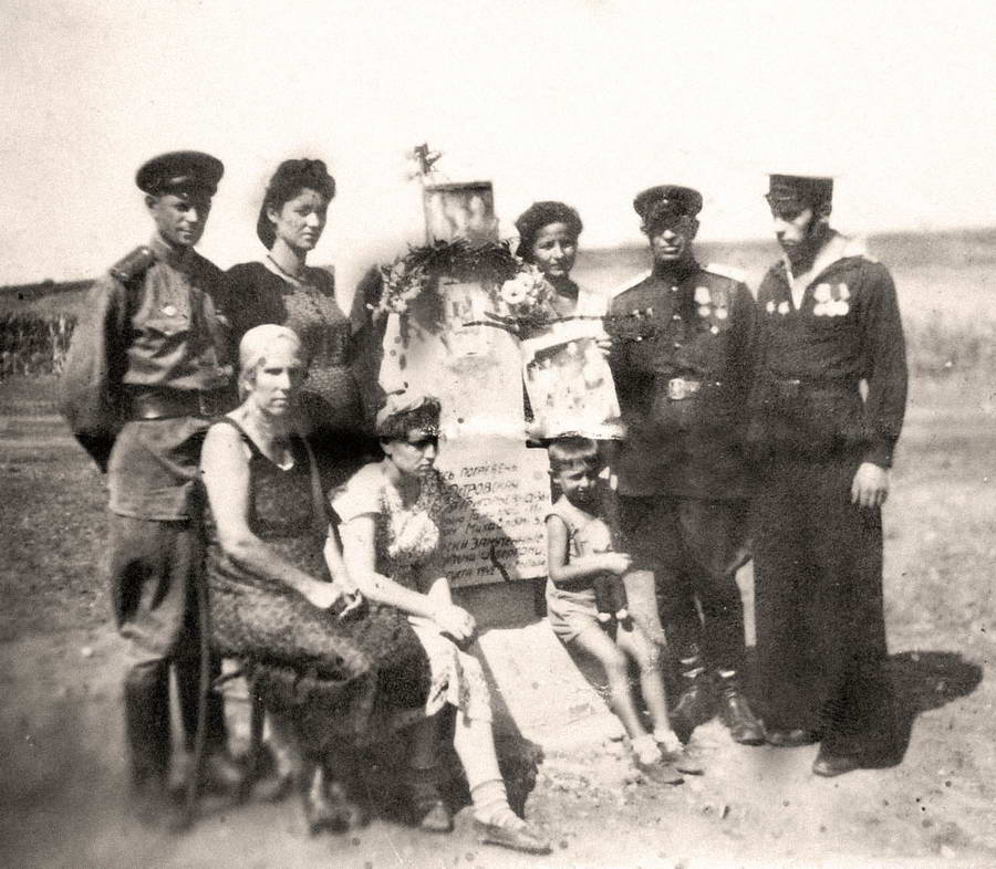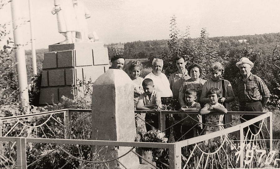 С собой они принесли и закрепили на обелиске дощечку, или фанерку, с едва различимой из‑за качества фотографии надписью: «Здесь погребены <…> Островская [Мари]я Григорьевна 30 л[ет] с дочерью Тамарой 11 л[ет] и сыном Михаилом 5 л[ет], зверски замученные фашистскими извергами [11 ав]густа 1942 г. в г. Ростове» . Женщина справа прижимает к груди увеличенную фотокарточку, еще две карточки пришпилены к навершию обелиска и наконечнику звезды. На всех трех фотографиях различимо по три лица: по всей видимости, это и есть перечисленные на дощечке трое Островских, а собравшиеся — их близкие родственники.