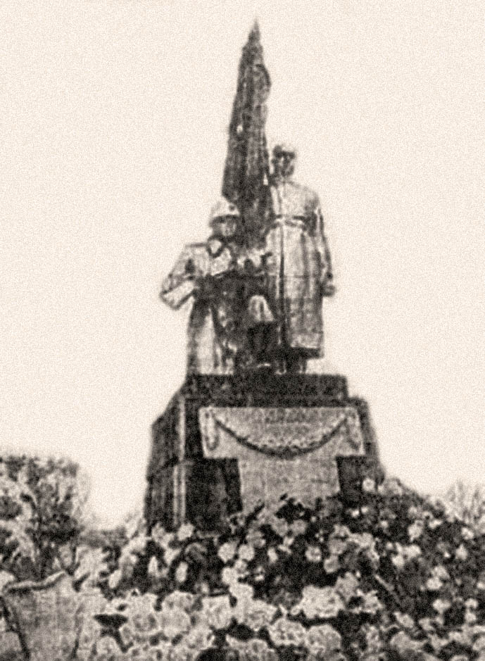 Под торжественные звуки Государственного гимна Советского Союза с памятника медленно сползает полотно. Перед глазами собравшихся — монументальная скульптура, изображающая двух воинов. Один, обнажив голову, прильнул к древку красного знамени, другой застыл в скорбном коленопреклонении, сжав в руках орудие мести. На пьедестале надпись: