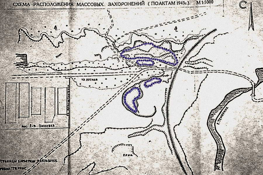 Цифра эта сложилась из результатов частичной эксгумации и грубой оценки емкости девяти ям‑могил на четырех различных расстрельных местах в Змиевской балке: 1) в песчано‑каменном карьере — три ямы, 15 тыс. человек; 2) в балке, на опушке рощи, в 500 м к востоку от Змеевка‑2 — одна яма, 10 тыс. человек; 3) на западной опушке рощи между поселками Змеевка‑2 и Западный — четыре ямы, около 2 тыс. человек и 4) в балке, севернее проселочной дороги, ведущей к Змеевке‑2, в 250 м к западу от железной дороги, ведущей на станцию Хапры, — одна яма, 150 человек. Как чисто еврейский в акте назван только один — второй по величине — 10‑тысячный контингент .