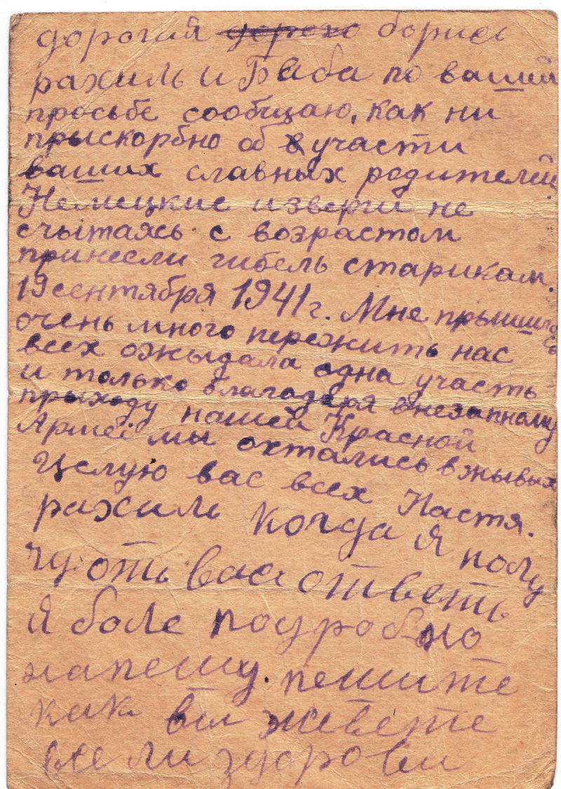 Сообщение из Винницы от няни семьи Кратман Насти Савченко Рахили Грановской, матери Б. Б. Грановского, о гибели ее родителей.