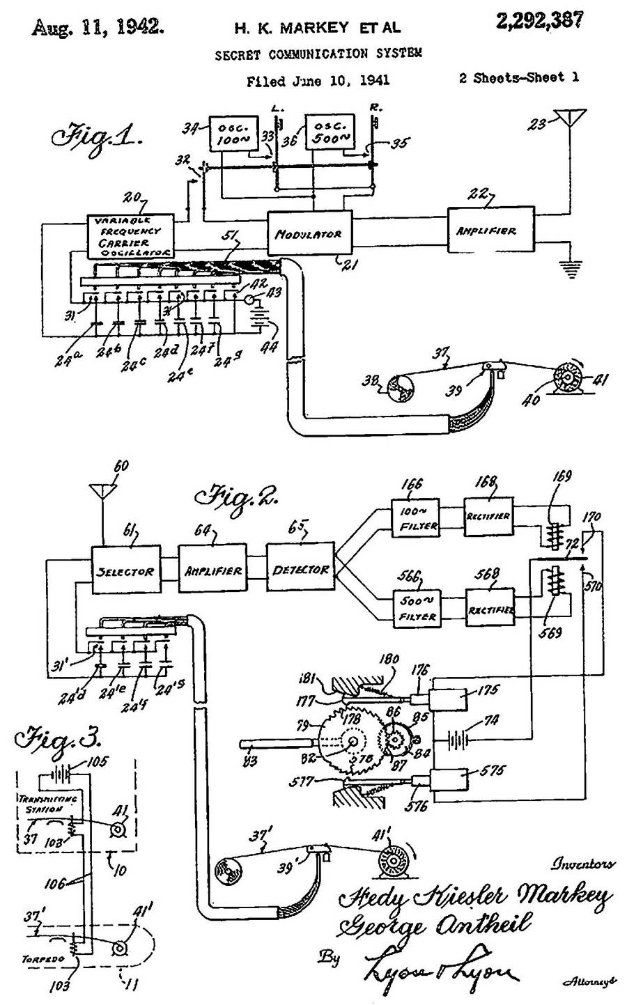 В конце 1940 года они отправили чертежи в Национальный совет изобретателей, в 1941‑м подали заявку на патент. В том же году об их проекте управляемой торпеды узнали в ВМС США, но отклонили его как слишком сложный — хотя патентное ведомство выдало два патента на «Систему секретной связи» Антейла–Ламарр. Военные получили патенты, но не использовали их до 1960‑го, когда срок их действия завершился: на основе этих проектов разработали похожую технологию широкополосного радиосигнала с размытым спектром частот, которая в дальнейшем привела к созданию беспроводной связи, разведывательных беспилотных летательных аппаратов, спутниковой связи, системы спутниковой навигации и беспроводных телефонов.