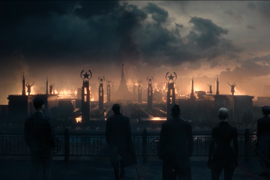 Прощание героев с Москвой в фильме — не такое, как в романе. С Воробьевых гор сатанинская шайка наблюдает пожар Москвы, зажженной от примуса Бегемота. Вслед за «нехорошей квартирой» взрывается огнем Библиотека имени В. И. Ленина. Воланд иронически цитирует фразу из рукописи, которую Мастер уничтожил в момент ареста: «Тьма, пришедшая со Средиземного моря, накрыла ненавидимый прокуратором город», — а потом спрашивает Маргариту: «Все счета оплачены?» Та отвечает: «Да».