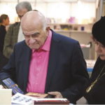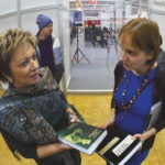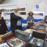 - Берта и Михаил Гринберг и ассистент атташе по культуре посольства Государства Израиль в РФ София Скуратовская на объединенном стенде израильского посольства и издательства «Мосты культуры / Гешарим»
