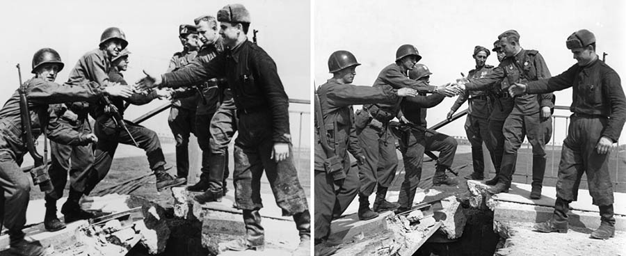 25 апреля 1945 года на берегу Эльбы американские и советские войска впервые сошлись лицом к лицу. На следующий день корреспондент Аллан Джексон, сопровождавший американскую армию, решил зафиксировать этот момент для истории. Но он не смог объясниться с красноармейцами и попросил помочь переводчика. Им оказался Хаим Тау, солдат, знавший языки и знавший цену каждому слову. Именно он привел американцев и русских к той точке, где должно было состояться рукопожатие, и показал, как встать, как повернуться к объективу. Без него этой фотографии не было бы.