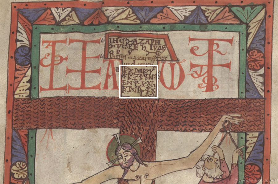 В некоей рукописи XI века в сцене распятия надпись на этой табличке приведена на латыни, но греческими буквами, а роль древнееврейского играют англосаксонские руны. Спустя несколько сотен лет итальянский художник Андреа Мантенья в сцене «Се человек» (около 1500 года) слева от скорбного Христа изобразил зловещего персонажа в бумажной короне, покрытой нечитаемыми письменами, которые подражают сирийскому (!) алфавиту.
