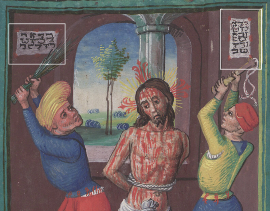 Впрочем, псевдоеврейские буквы в качестве отрицательного маркера появлялись не только в мире изображений. Американский историк Рут Меллинкофф в книге «Отверженные. Знаки инакости в североевропейском искусстве позднего Средневековья» обратила внимание на то, что в ходе постановок страстных мистерий, которые обычно бывали ожесточенно юдофобскими, роль древнееврейского языка могла исполнять бессмысленная смесь идиша, латинского и немецкого.