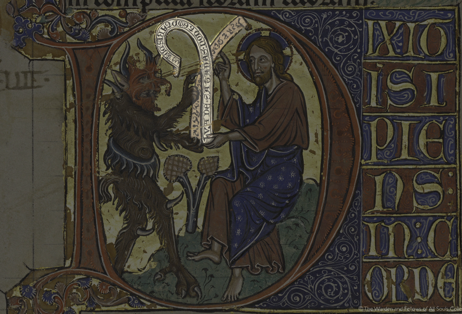 В английской Псалтири середины XIII века перед текстом 52‑го псалма изображена сцена искушения Христа в пустыне: Иисус, а перед ним звероподобный дьявол с длинным крючковатым носом. Их реплики, как было принято в иконографии того времени, написаны на двух свитках: у Христа текст латинский, а у дьявола — псевдоеврейский.