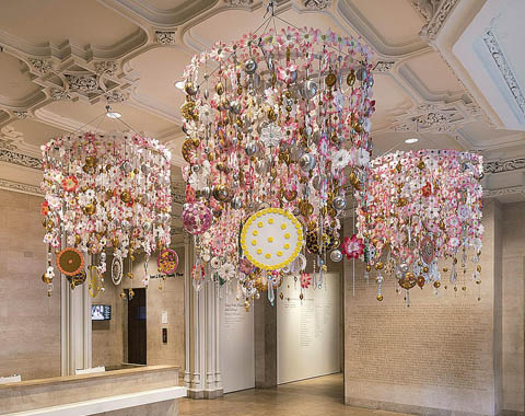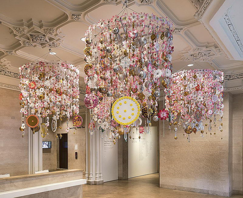Впервые нью‑йоркский музей решил подвергнуть художественному преобразованию собственное фойе в 2013 году, с тех пор подобные интервенции стали традиционными. В этот раз проект «Используя стены, полы и потолки» доверили реализовать бразильской художнице Беатрис Милхас, ее вдохновлял карнавал в Рио. Получилось пестро и красиво.