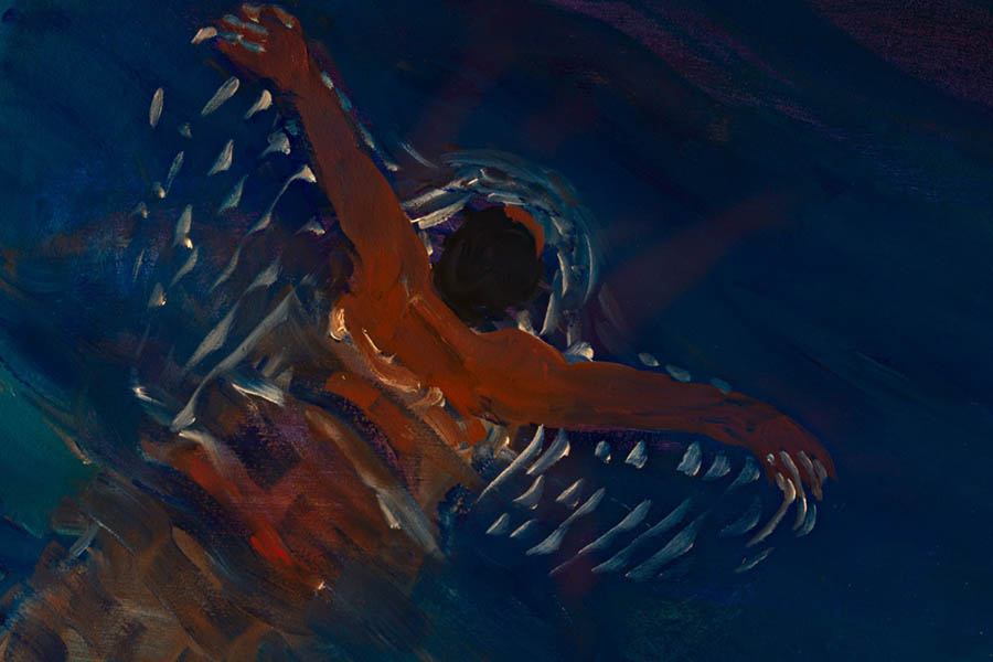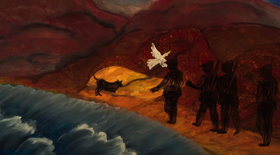 На первый взгляд, 15‑минутная работа французского режиссера Флоранс Мийель выглядит как созерцательное путешествие по воде и памяти. Пожилой мужчина плывет в рукотворном, написанном вручную море, вспоминает детство, насмешки сверстников и заботливую мать, которая всегда приходила ему на помощь.