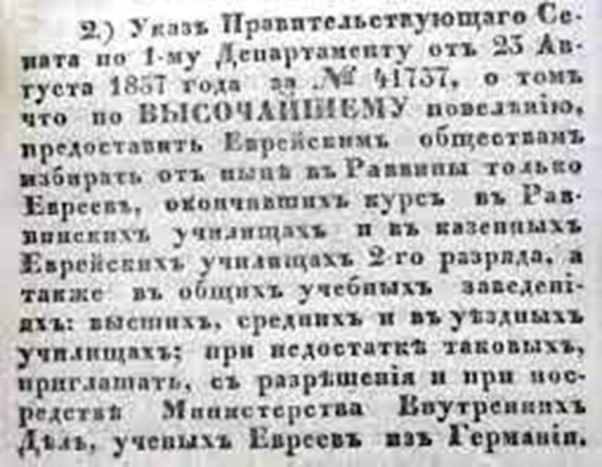 В середине XIX века были созданы Раввинские училища, которые соответствовали курсу гимназии (надо отметить, что гимназии готовили чиновников, то есть государство даже здесь не отошло от своих намерений превратить раввинов в своих чиновников), за исключением естественной истории и древних языков. На подготовку раввинов как таковую отводилось всего два года, плюс один год «практики».