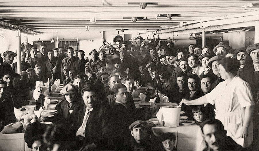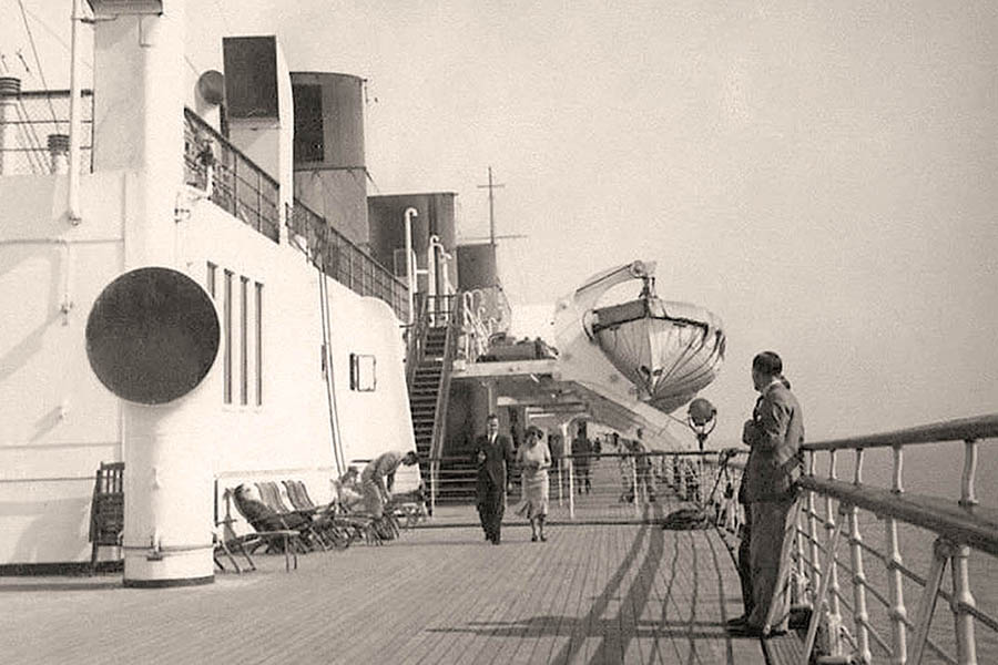 Рядом с нами сидит шаперонка. У нее строгое, умное лицо и жесткие, как проволока, серебряные волосы. Она, специально приставленная присматривать за девушками, в первый же вечер нашла себе кавалера — пожилого высокого мужчину. По ночам она была так занята собственной моралью, что три ее подопечные всю дорогу свободно танцевали, пьянствовали и шастали по чужим каютам.