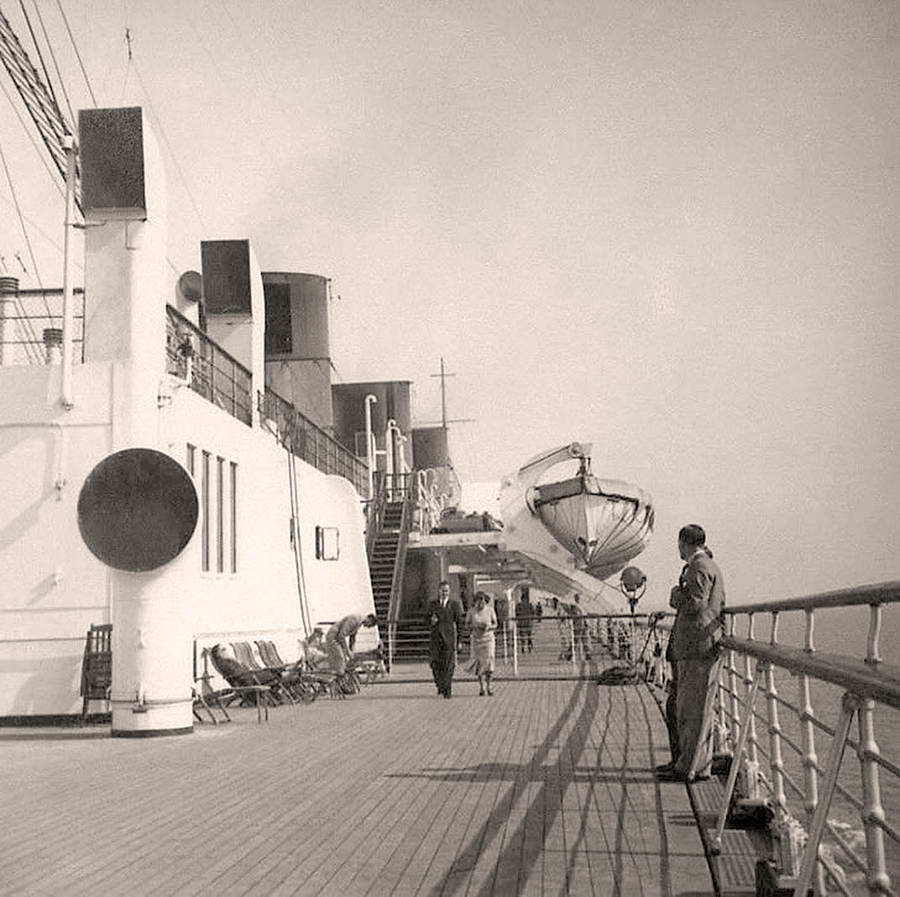 На палубе столько солнца, что кажется, все обернуты тонким слоем света, как целлофаном. Солнечные улыбки. Солнечные приветствия и рукопожатия. Солнце на руках, на шеях, на голых плечах, на лицах. Костюмы, платья, чулки и глаза выглядят теплее, светлее и прозрачнее. Волоски на обнаженных женских ногах, подставленных солнечным лучам, как на показ, поблескивают, словно травинки. Золотистые пушинки мельтешат в воздухе, как алмазные пылинки из‑под метлы, когда она, точно по пословице, стреляет хвостом кометы в залитой солнцем комнате.