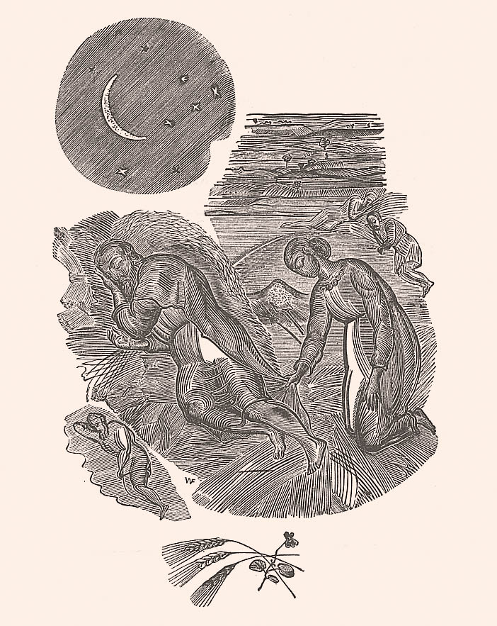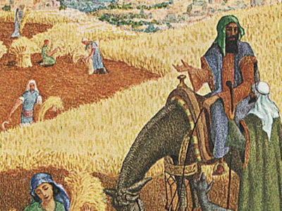 Глава 2. Развитие действия. Бейт‑Лехем. Рут, как бедная вдова, идет в поле подбирать колосья (библейская форма социальной помощи бедным) и случайно попадает на поле богатого землевладельца Боаза, который по счастливой случайности оказывается близким родственником семьи (то есть потенциальным выкупателем имущества Элимелеха). Здесь завязывается второй важный мотив «надежного покровителя», или гоэла (родственника‑искупителя). Боаз относится к Рут благосклонно и с особой заботой (велит жнецам нарочно оставлять пшеницу, чтобы ей досталось больше). В конце дня Рут возвращается к Ноами не с пустыми руками, а с целой мерой пшеницы, добытой благодаря щедрости Боаза. Обращает на себя внимание симметрия сцен: эпизод, где Рут уходит утром в поле нищей собирательницей и возвращается вечером с изобилием зерна, повторяется и в следующей главе. Эти параллельные сцены создают композиционную ринфору (обрамление) и символизируют движение от пустоты к наполненности. Как отмечают исследователи, книга Рут вообще полна тщательно выстроенных парных элементов и контрастов: голод вначале — сытость в финале, одиночество Ноами — семейная радость в конце, общее непослушание эпохи Судей — частная добродетель Рут и Боаза, «пусто» vs. «полно» и т. д. Все эти противопоставления служат художественными приемами, усиливая центральную идею искупления и восстановления.
