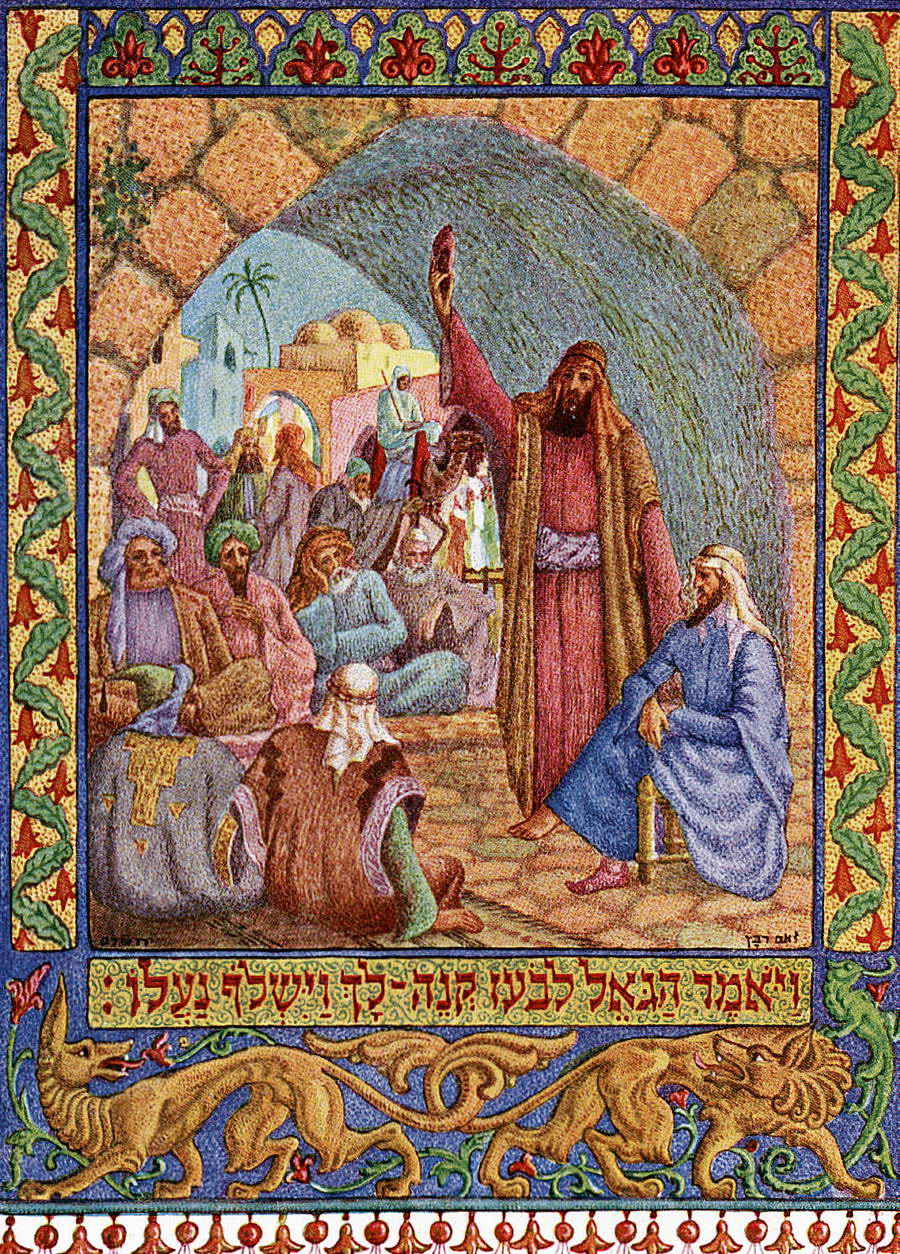 Глава 3. Кульминация. Ноами, понимая, что шанс на будущее семьи — в браке Рут с Боазом по закону левирата (обычай, когда ближайший родственник умершего должен взять вдову, чтобы продолжить род), разрабатывает смелый план. Ночью на гумне Рут приходит к Боазу и в традиционной завуалированной форме просит его исполнить обязанность выкупателя и жениться на ней. Сцена на гумне — эмоциональная вершина сюжета: тихий диалог среди стогов, полутени ночи, благородство и сдержанность героев. Здесь возникает мотив покрывала, или крыла: Рут просит: «простри крыло твое на рабу твою» (то есть защити и возьми в супруги). Этот образ «крыла» отсылает к словам Боаза из главы 2, где он благословил Рут, пришедшую под крыла Б‑га Израиля: снова повтор мотива, теперь с новым значением. Боаз поражен добродетелью Рут и соглашается, но появляется препятствие: есть другой, более близкий родственник, имеющий первоочередное право. Так автор вводит элемент сюжетной интриги: сумеют ли герои преодолеть препятствие? С формальной точки зрения мы видим типичную для многих сказаний структуру кульминации — ночное испытание, после которого наступает развязка на общественном собрании.