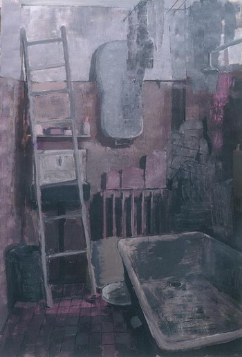 В самом начале 1980‑х, в первые годы эмиграции в Париже, он вдруг пишет серию огромных (порой больше двух метров в высоту) «Интерьеров» (1981). Не на холсте маслом — акрилом на бумаге. Коридор, ванная, стол с кипами книг, стены с радиоприемниками и розетками… Эти интерьеры явно не столько изображали пространство, сколько сами им становились. Бесприютным, с кучей каких‑то коробок за старым стулом и странно теплым, буквально розовым — благодаря цвету стен. В этих кипах бумаг, здоровенной лестнице у двери вроде бы ничто не говорило об уюте упорядоченной жизни. Не сыскать ничего, ради чего писали свои маленькие, аккуратные интерьеры (опять же предназначенные для украшения домов), скажем, голландцы. Но в этой неустроенности, являвшей себя с листов Рогинского, таилось тепло дома. То ли благодаря матерчатому абажуру, свисающему над невидимым столом, то ли из‑за жестяного корыта, висящего в ванной над батареей, то ли из‑за развешанного рядом белья….