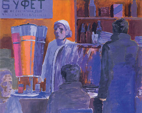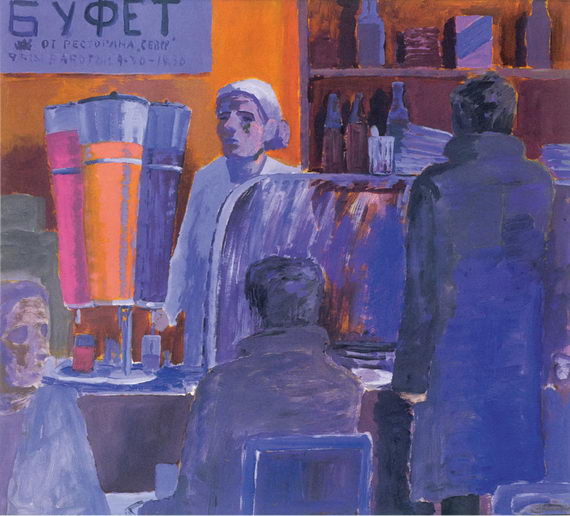 Понятное дело, что эти интерьеры не имели отношения к Парижу, как и написанные там же, во Франции, годом позже, виды «Буфета» с разноцветными соками, продающимися в разлив, или магазина с мрачноватым стеклянным прилавком, в конце которого одиноко стояла фигура продавщицы в белом халате и темном фартуке. На этих картинах уже не было «портретов» вещей, но, без сомнения, был портрет пространства. До боли знакомого мира «общепита» или «службы быта», бедного, не избалованного изобилием, не блещущего сервисом и дизайном. При этом в этих картинах не было ожидаемого гротеска, а их суровый сумеречный колорит таил странную прелесть. Казалось, именно цвет, живопись передавали усталую отстраненность женщин за прилавком, их терпеливое смирение перед жизнью.