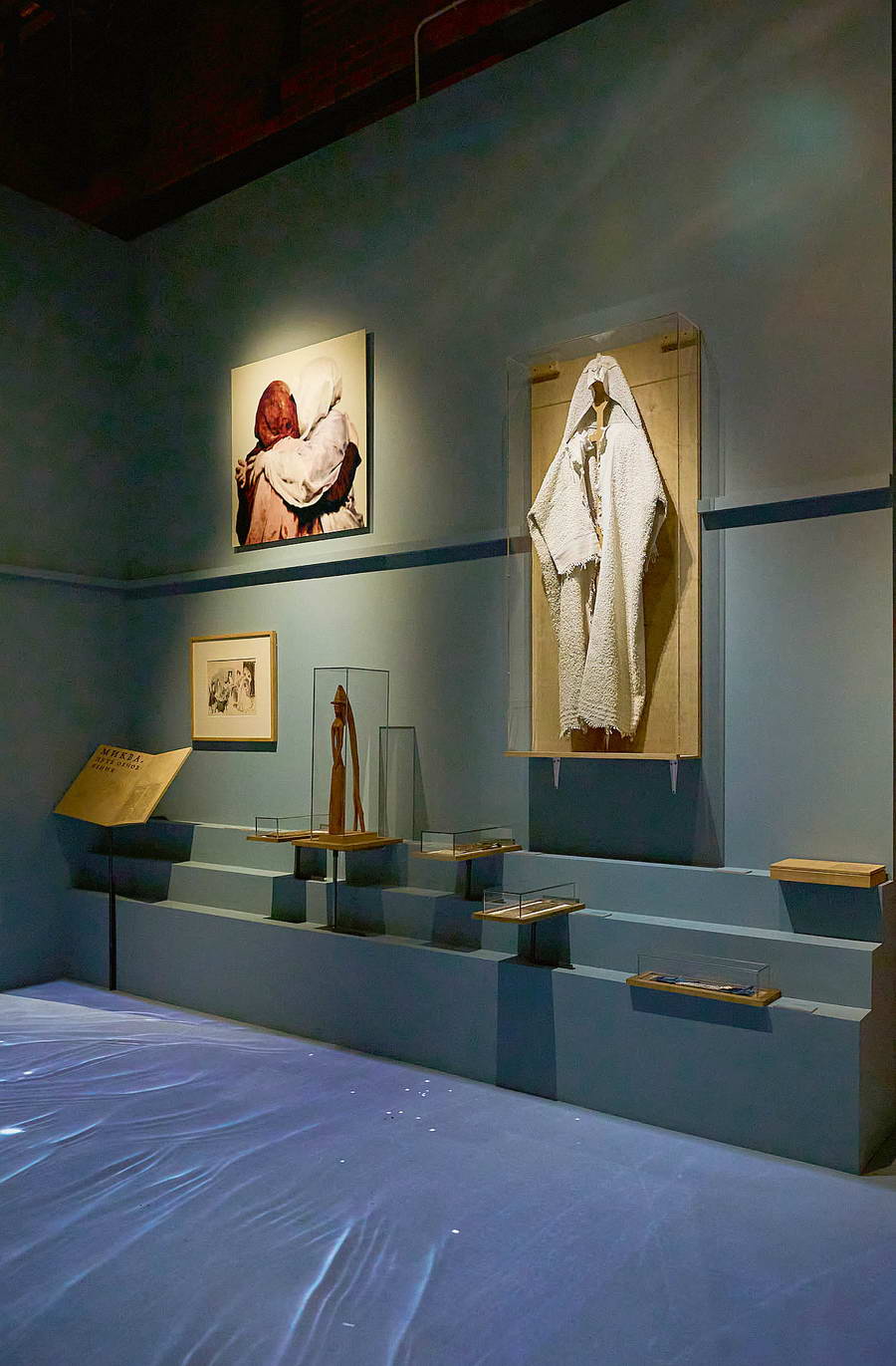 Серебряной неделей назывался у ашкеназов период, предшествующий свадьбе и наполненный множеством ритуалов. Попадая в пространство в нежных серо‑голубых оттенках, мы видим, как под ногами «разбегается» проточная вода миквы (инсталляция INTmedia).