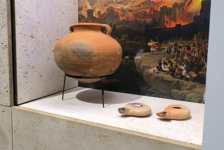 В одном из залов посетителя встречает на первый взгляд скромная витрина: медный котел, две масляные лампы, кувшин. Попович‑Геллер объясняет: в этой простоте — история выживания. Иосиф Флавий писал о повстанцах, скрывавшихся от римлян в резервуарах и дренажных каналах Иерусалима. Эти горшки и лампы — то, что люди приносили туда с собой: свет, пищу, надежду.