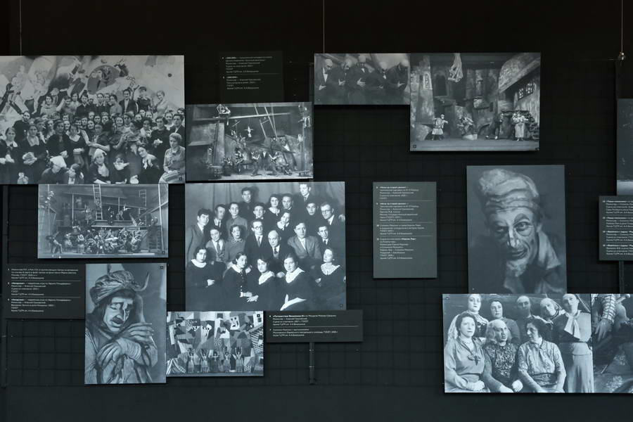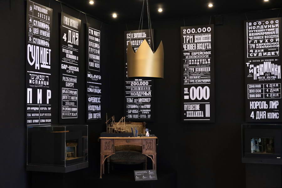 На стенах — графическая композиция из афиш спектаклей ГОСЕТа и фотографии из сцен, предоставленные Государственным театральным музеем имени А. А. Бахрушина. На них мы видим лица актеров. В большинстве своем это бывшие жители еврейского штетла, реквиемом по которому звучали многие спектакли ГОСЕТа.