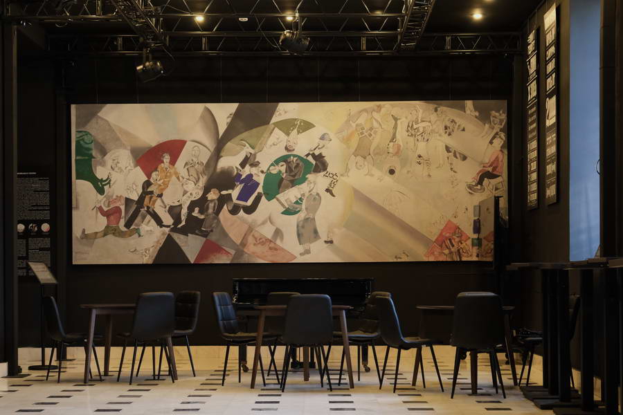 Выставка в фойе на Варшавке выстроена в формате летописи. Кураторы проекта, искусствовед Евгения Гершкович, художник Наташа Шендрик и специалист по еврейской культуре Ирина Пекарская, предлагают начать осмотр экспозиции с легендарного панно Марка Шагала «Введение в еврейский театр», подлинник которого хранится в Третьяковской галерее.