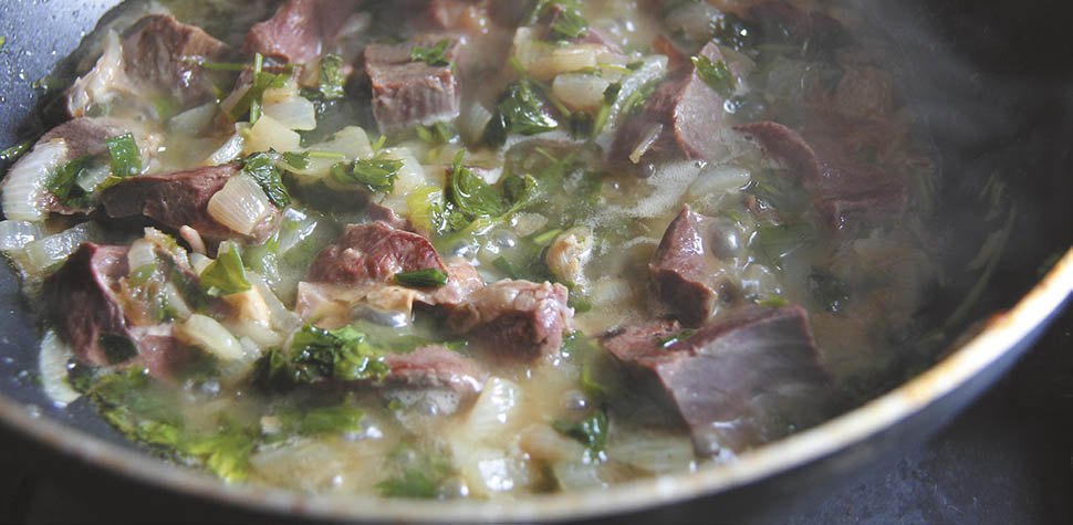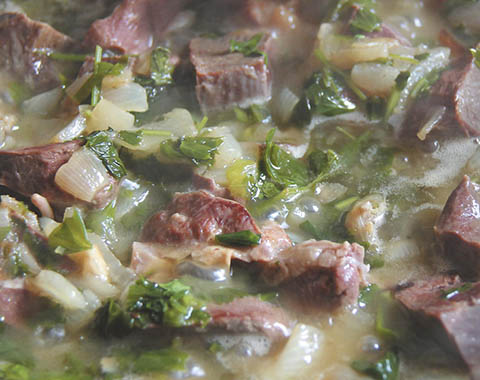 Ингредиенты: 100 г растительного масла, 3 мелко нарезанные средние луковицы, 750 г говядины (мякоть, плечевая часть), нарезанной кубиком, как на гуляш, соль по вкусу, 1 ч. л. (или по вкусу) черного перца, 0,5 ч. л. куркумы, 4 стакана кипящей воды, 100 г замоченной накануне красной фасоли, 4 сухих черных иранских лимона, 4 стакана мелко нарезанной петрушки, 1 стакан мелко нарезанной кинзы, 1 стакан мелко нарезанного зеленого лука, 1 ч. л. шамбалы (это листья хильбе, пажитника сенного, — приятной травки, которую можно просто так жевать), сок 1 лимона, полстакана мелко нарезанной мяты.