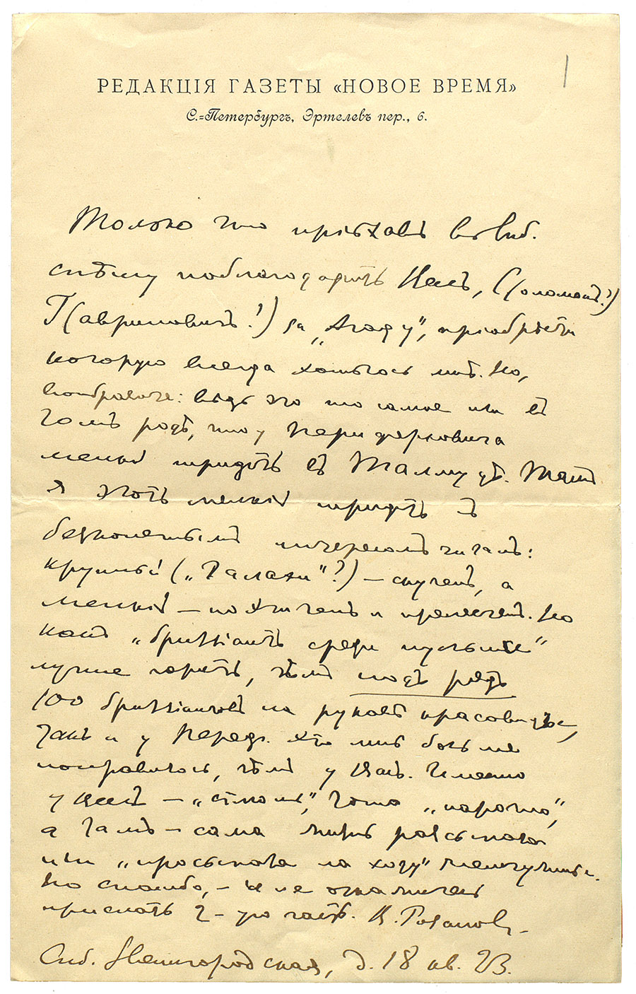 Только что приехав в Спб., спешу поблагодарить Вас, С(оломон?) Г(аврилович?), за «Агаду», приобрести которую всегда хотелось мне. Но вообразите: ведь это то самое или в том роде, что у Периферковича мелкий шрифт в Талмуде. Там я этот мелкий шрифт с бесконечным интересом читал: крупный («Галахи»?) — скучен, а мелкий — поэтичен и прелестен. Но как «бриллиант среди пустышек» лучше горит, чем подряд 100 бриллиантов на рукаве красавицы, так и у Переф[ерковича] это мне больше понравилось, чем у Вас. Именно у Вас — «сплошь», точно «нарочно», а там — сама жизнь рассыпала или «просыпала на ходу» жемчужины. Но спасибо — и не откажитесь прислать 2‑ю часть. В. Розанов.