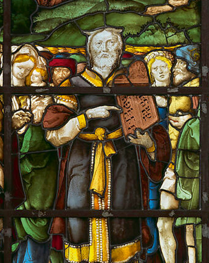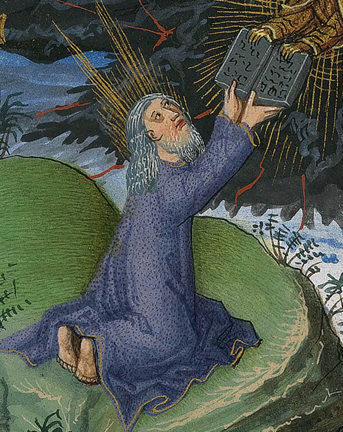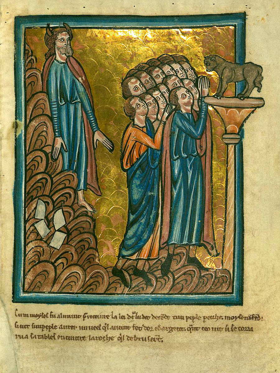 Как сказано в книге Исход, Моисей дважды поднимался на гору Синай, где говорил с Б‑гом. В первый раз Г‑сподь вручил ему две скрижали с заповедями, которым должен был следовать народ Израиля. Однако по возвращении пророк обнаружил, что евреи впали в идолопоклонство и стали почитать золотого тельца. После этого он «воспламенился гневом и бросил из рук своих скрижали и разбил их под горою». Тогда, по велению Г‑спода, он сам изготовил две каменные таблички и с ними во второй раз поднялся на гору. Г‑сподь вновь продиктовал ему свои десять заповедей. После 40 дней и 40 ночей на вершине горы Моисей, осененный Б‑жественной благодатью, вновь спустился к народу. В латинском переводе, который сделал Иероним, говорится, что, спустившись с Синая, Моисей «не знал, что лицо его стало рогато».