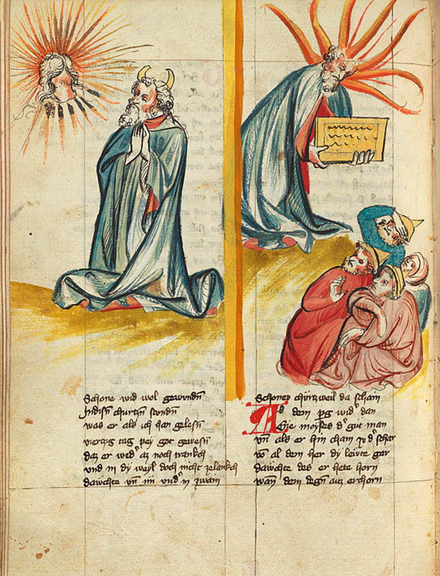 В немецком «Евангелиарии» аббатисы Уты есть крошечная сцена преображения Господня: Христос вместе с учениками взошел на гору, «просияло лице Его, как солнце, одежды же Его сделались белыми, как свет. И вот, явились им Моисей и Илия, с Ним беседующие» (Мф., 17:2–3). На миниатюре по правую руку от Спасителя выглядывает Моисей, у которого посреди лба торчит один длинный рог.